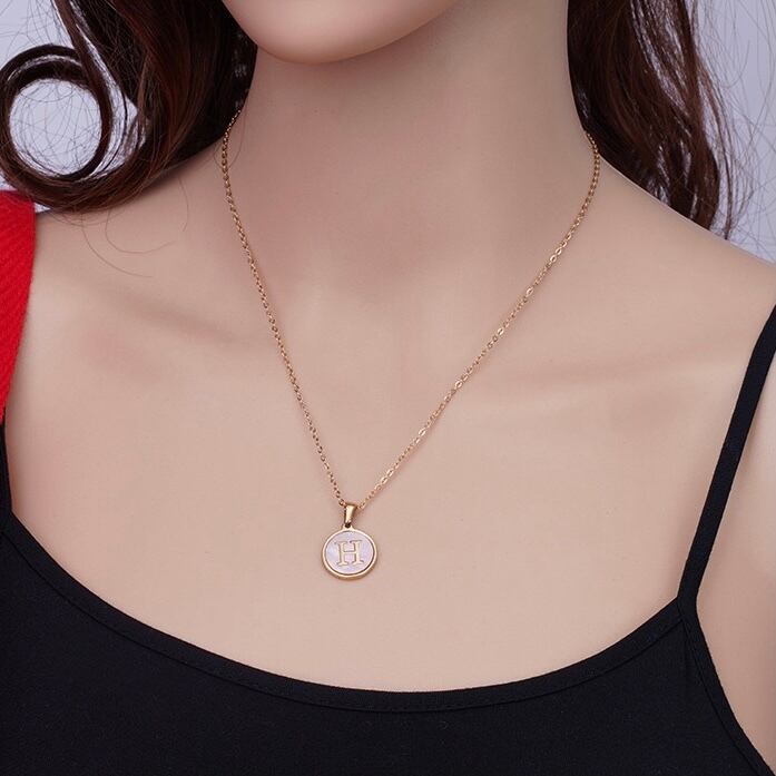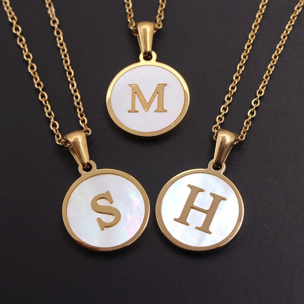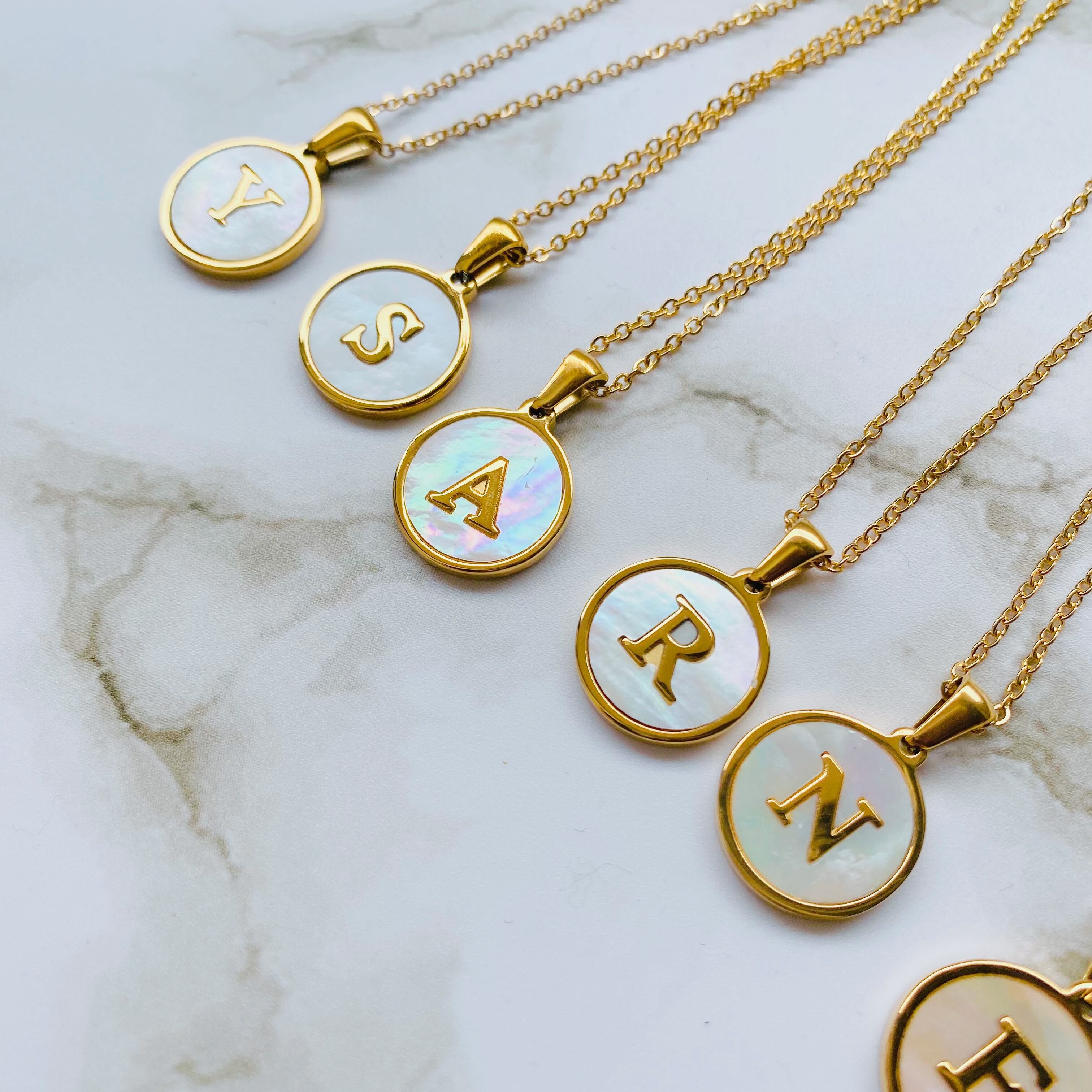 偏光ホワイトにゴールド、丸いモチーフの中にイニシャルがかわいいネックレス✨
