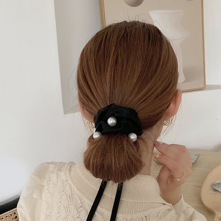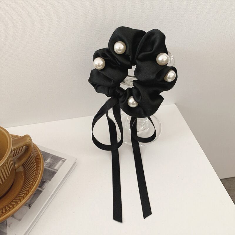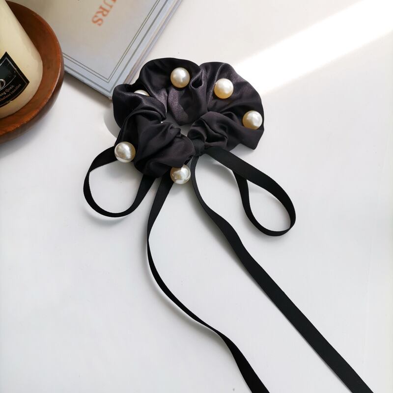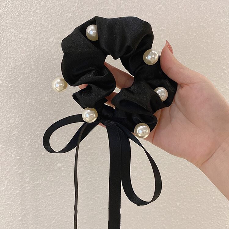 ドットのように散りばめられた大粒パールと、たらーんと伸びたリボンが可愛いシュシュ♡