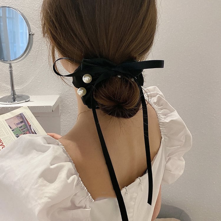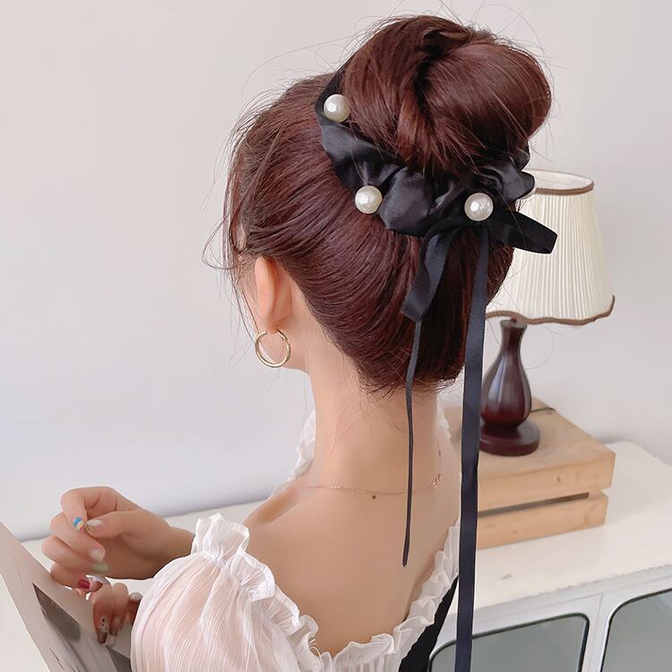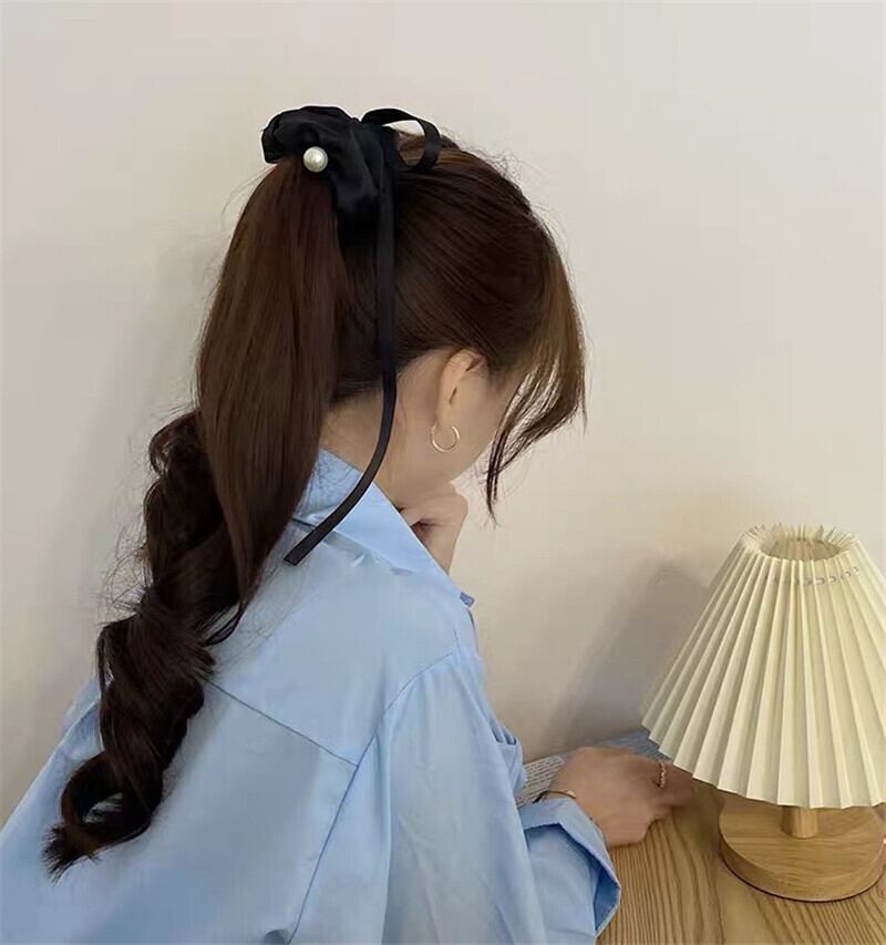 パールのアクセントで目線も上に、垂れたリボンが後毛のような効果で首筋をキレイに見せてくれるので小顔効果とスタイルアップも狙えちゃう可愛いだけじゃないアイテム♪