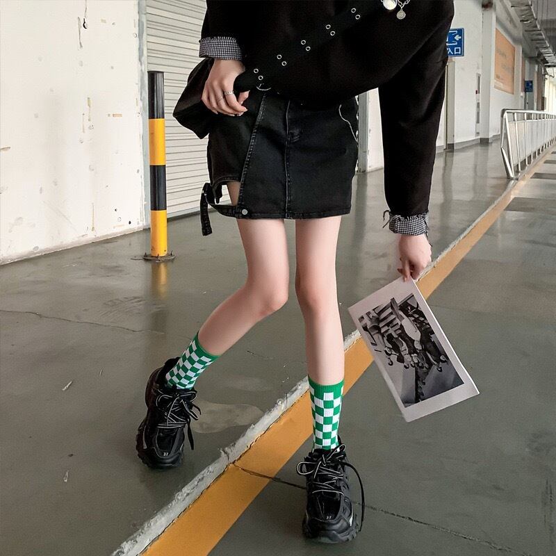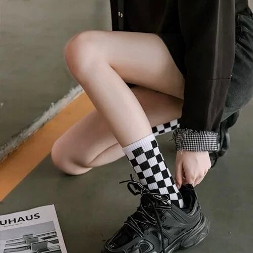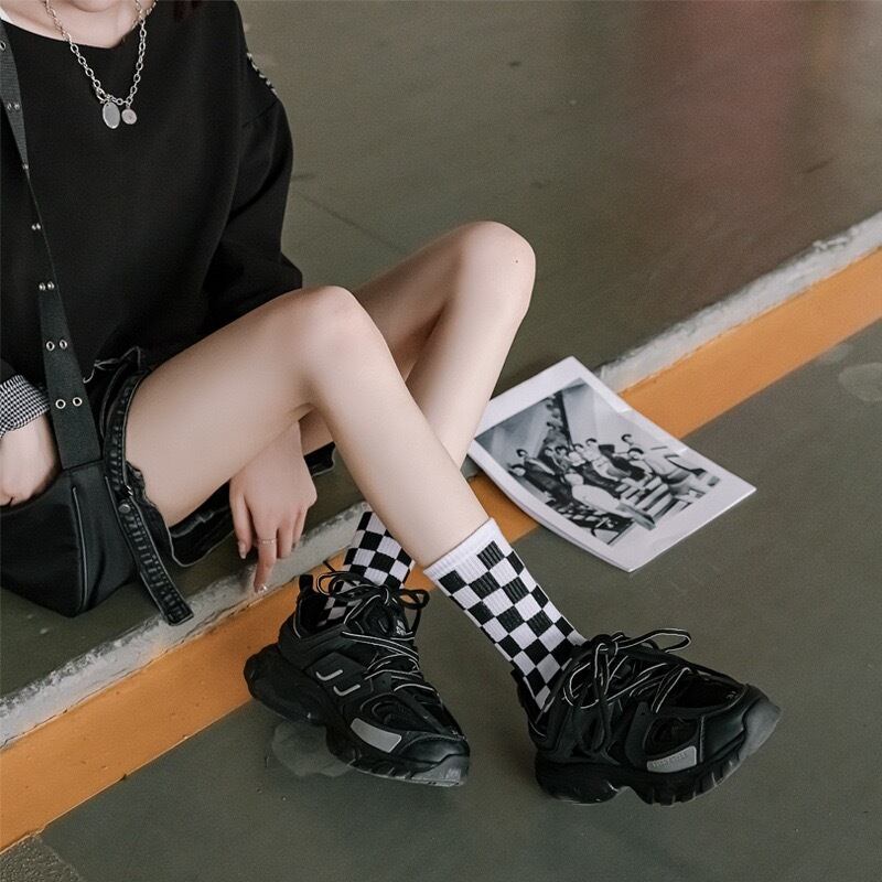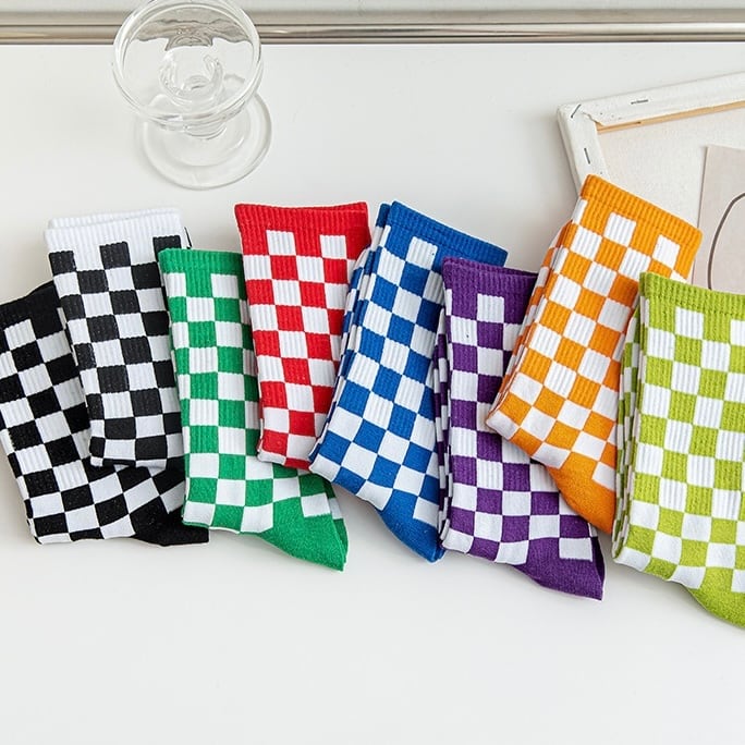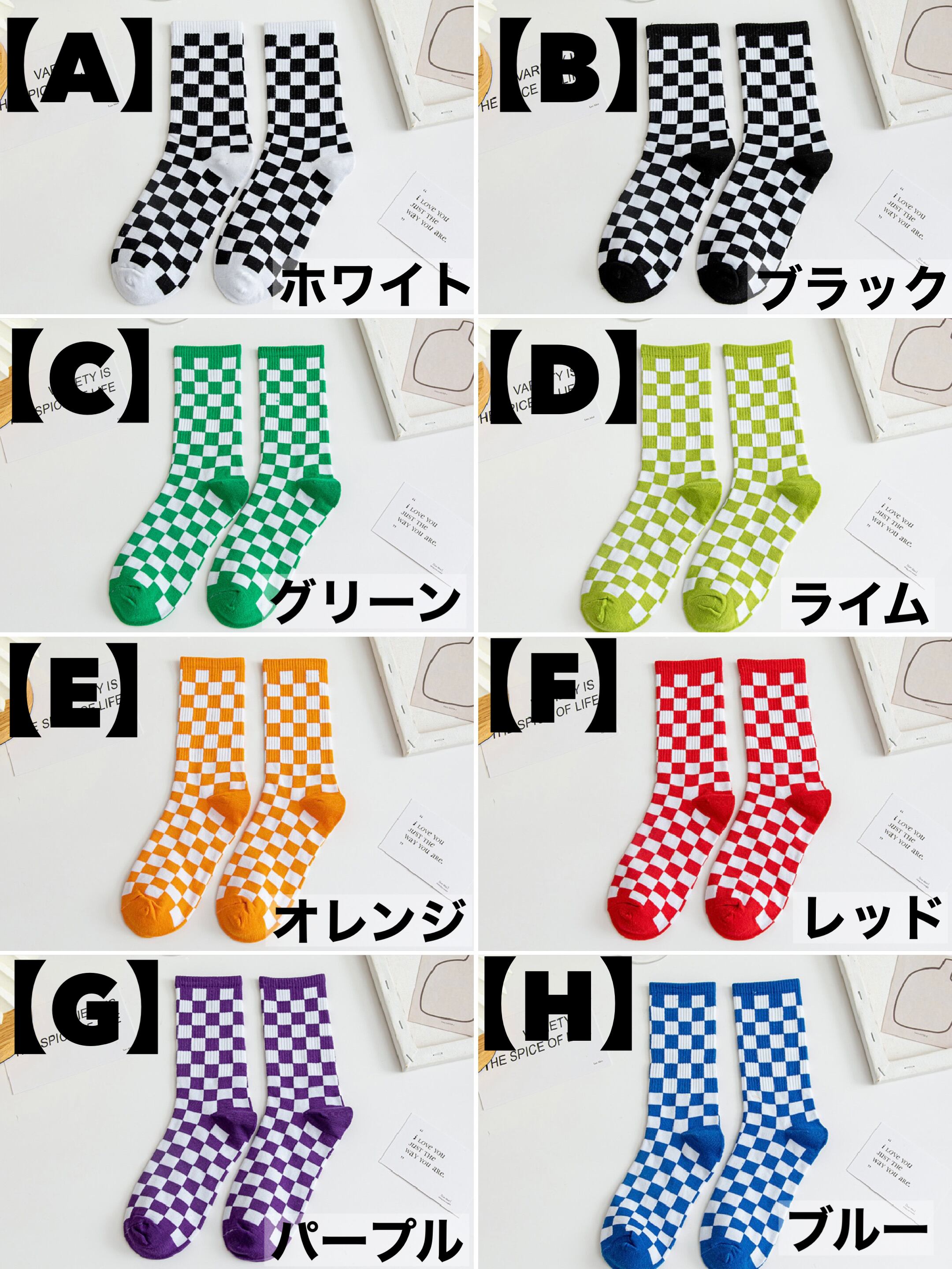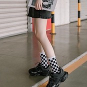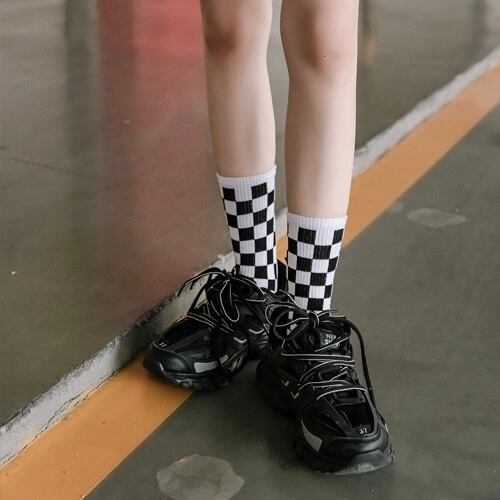 流行りのチェッカーフラッグも靴下なら取り入れやすいので、カジュアルコーデがお好みのママさんにも◎