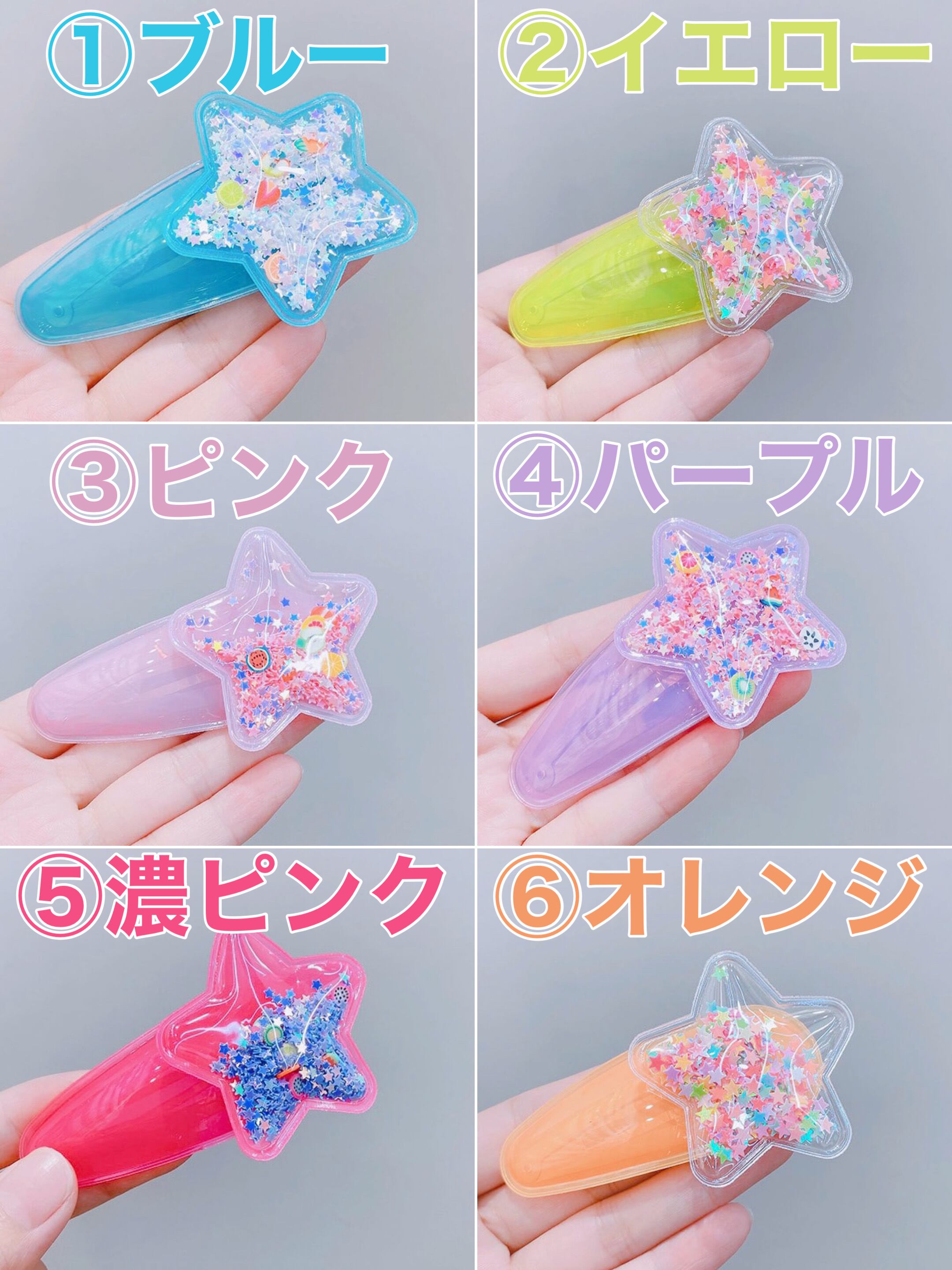 ※①、③、④、⑤は単色スタースパンコールにフルーツのパーツ、②、⑥にはカラフルなスタースパンコールが入っています★