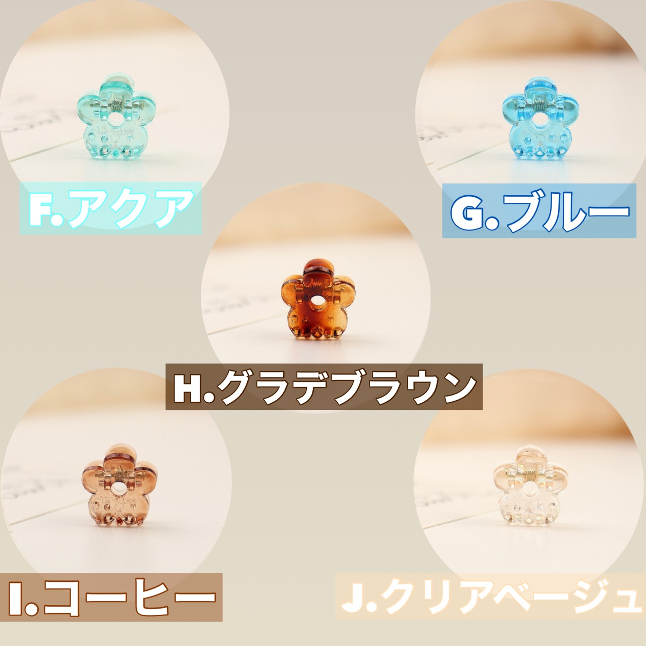 ※採光環境の都合で、正確な色味での撮影が困難でした。5色ずつのまとめ画像のほうが実際の色味に酷似しており、個別画像については注意書きをご参考ください。
