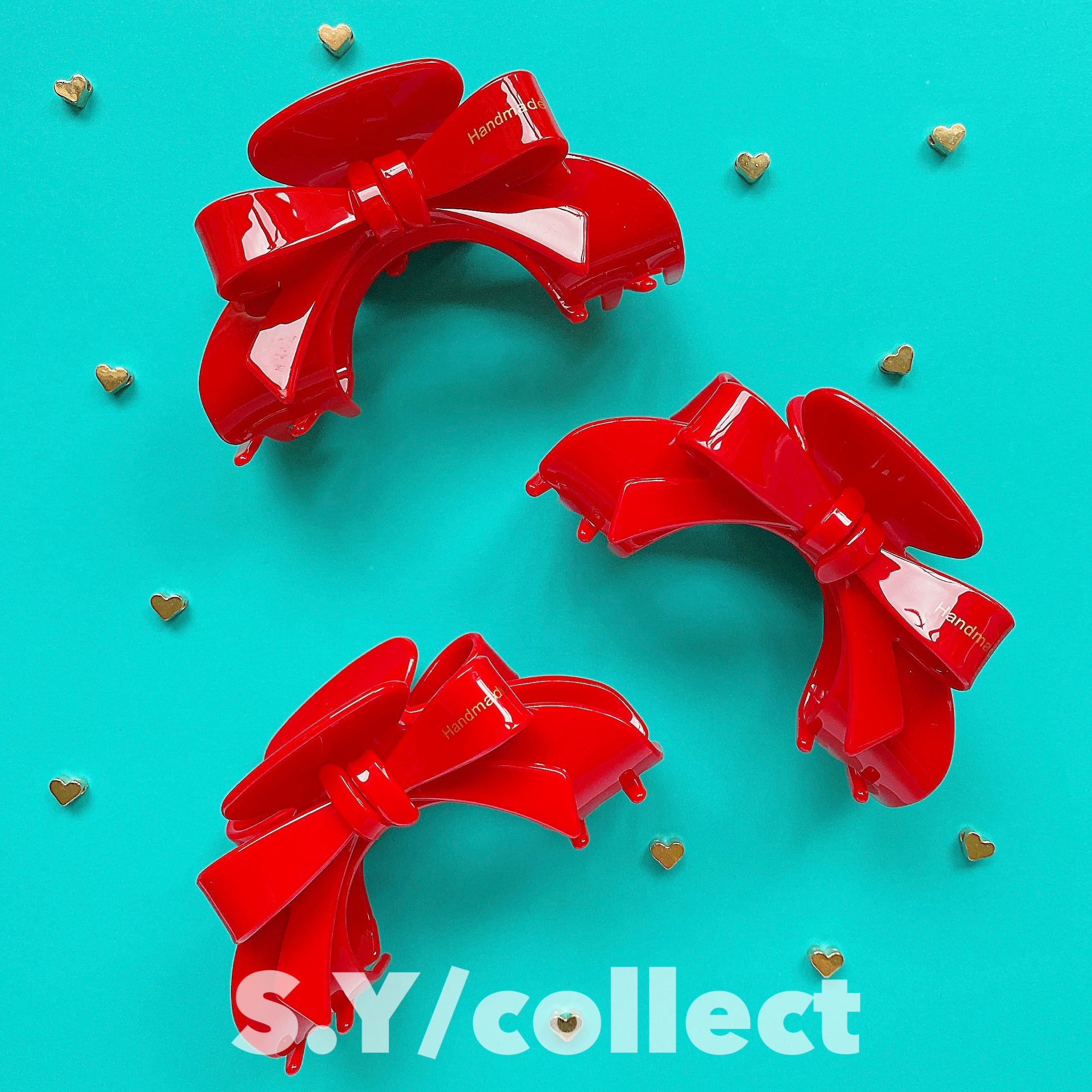パキッとしたビビッドな真っ赤、リボンのデザイン、ゴールドの“Handmade”のロゴ…