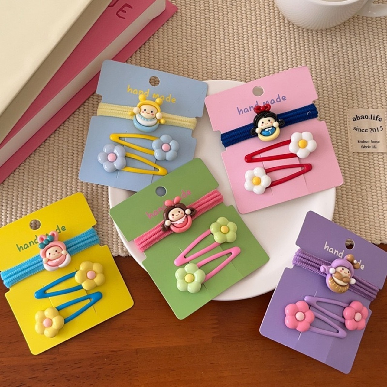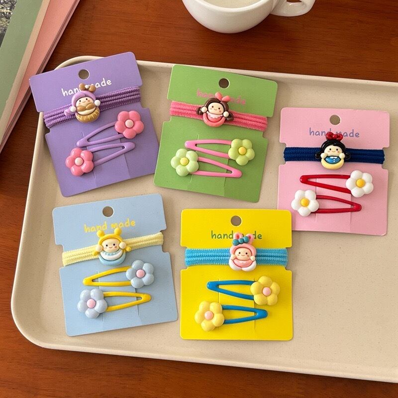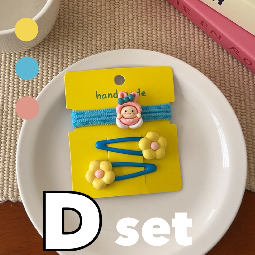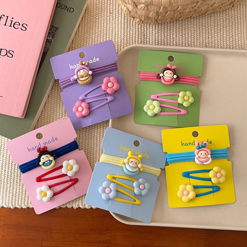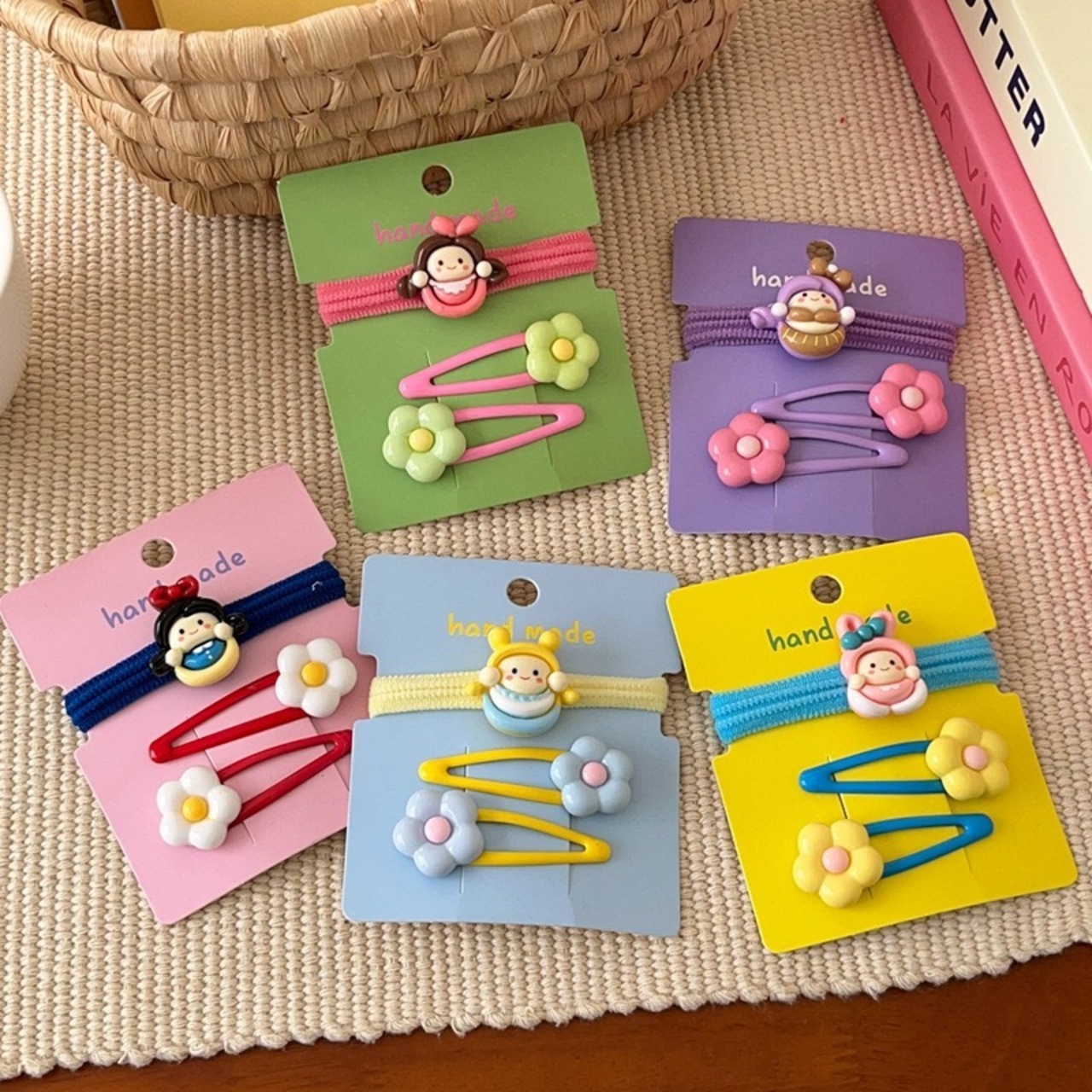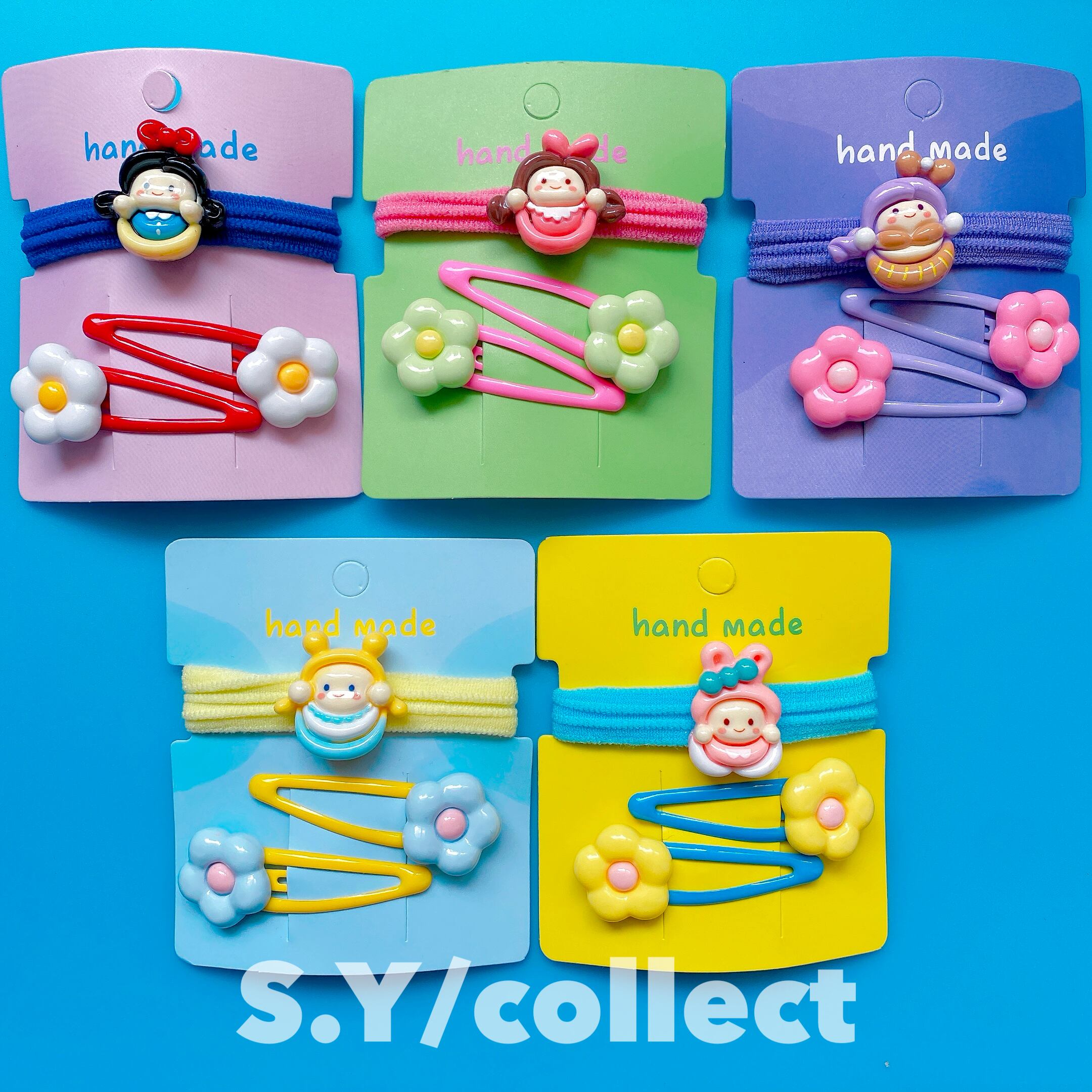 それぞれ雰囲気の違うおんなのこのモチーフがどれも可愛くて、ヘアゴム+お花のぱっちんピン2つがセットになったお得アイテム.ᐟ.ᐟ♥